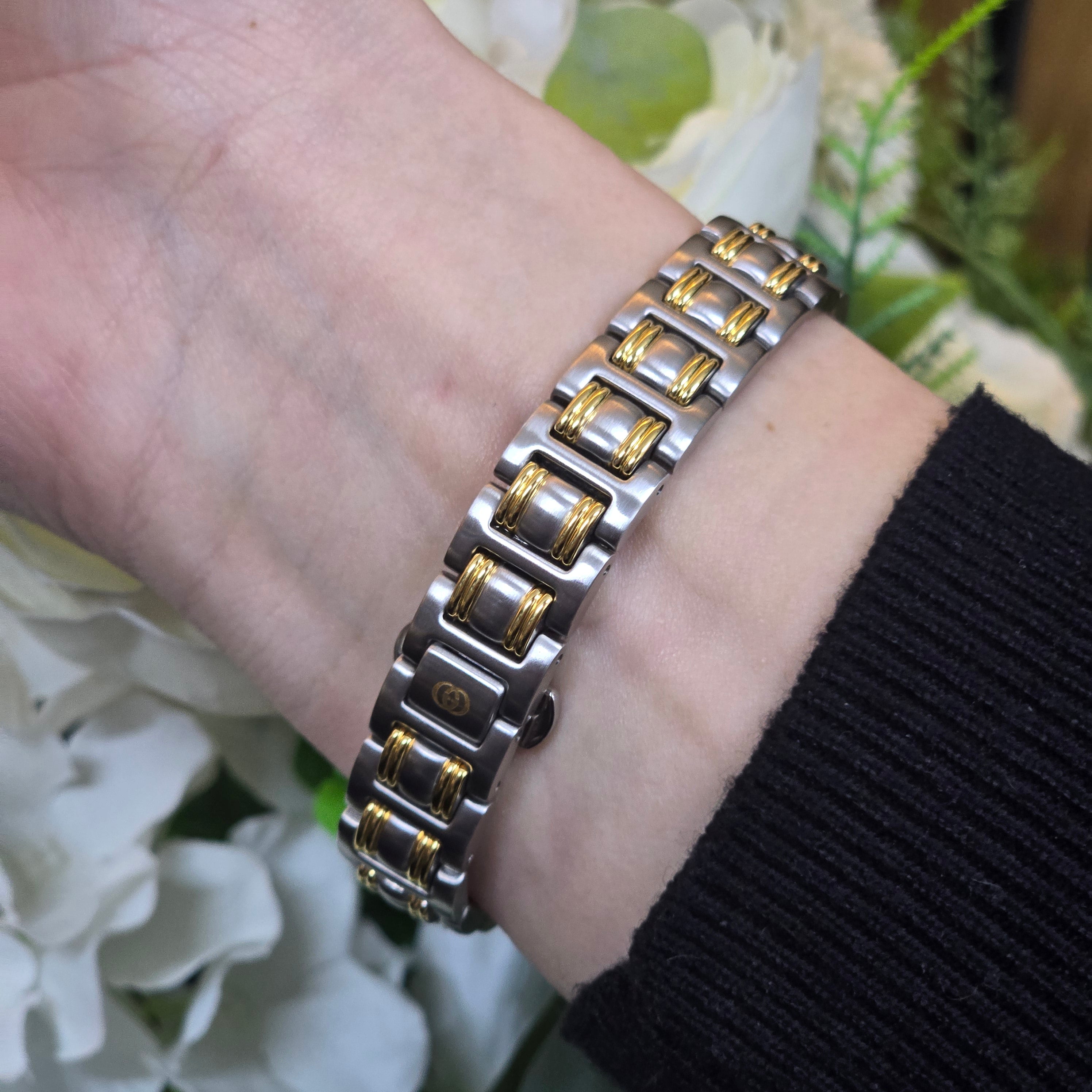 The example we have for sale here is the Ladies Gucci 9040L, a beautifully balanced 26mm model crafted in stainless steel with gold-plated accents. Featuring a warm cream dial with gold hands and indices, along with a discreet date window at 6 o’clock.