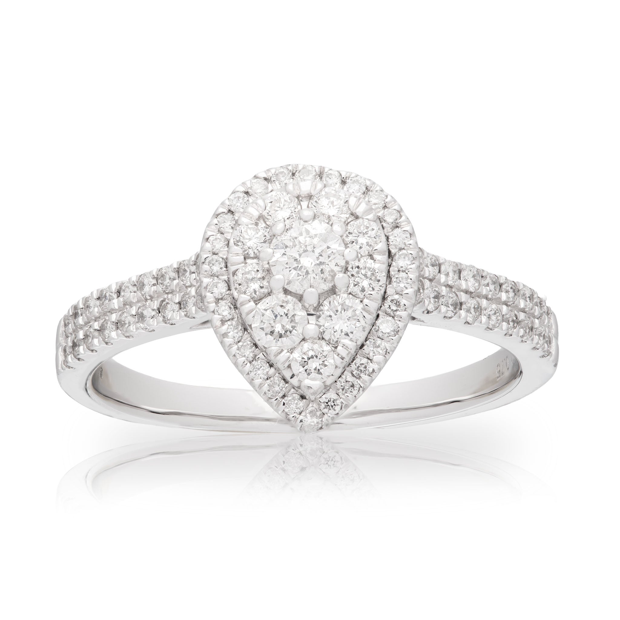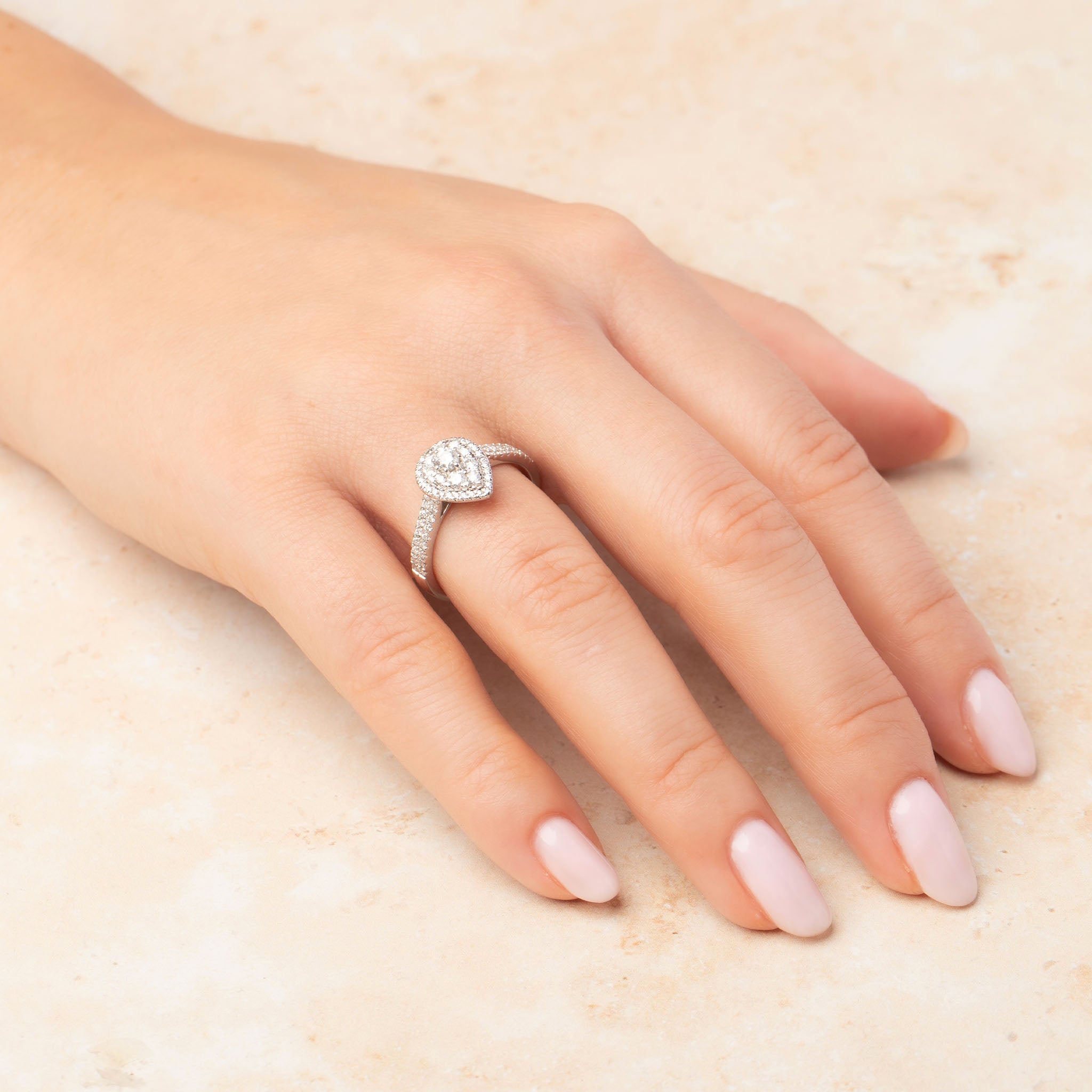 • Set with a 0.75ct cluster of natural round brilliant diamonds in a pear-shaped design, with accented shoulders