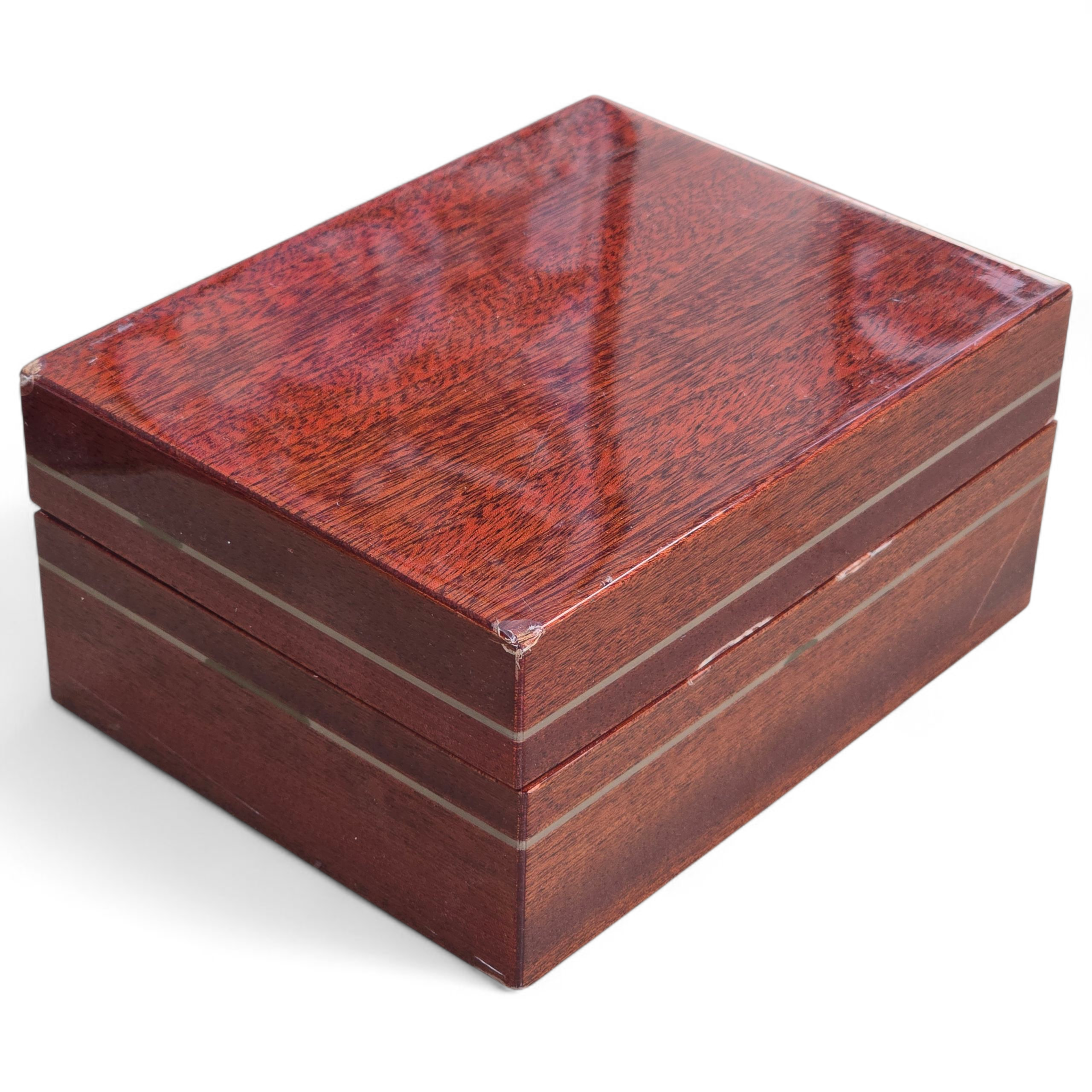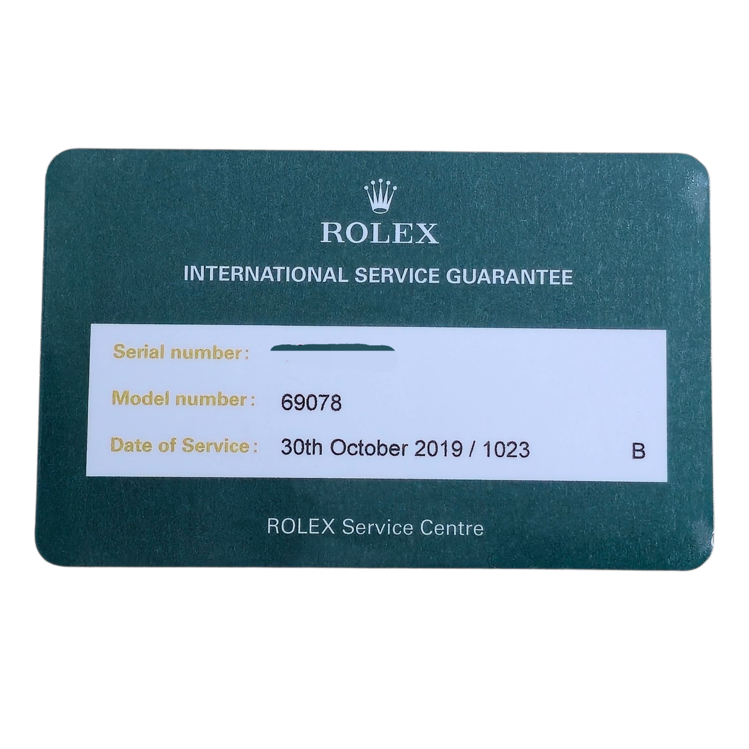 It comes with three separate Rolex official service documents dated from 2003/2012/2019 and a pressure test certificate of 100M (330Ft) from our watchmaker in October 2025. the original Rolex box is no longer with the watch however it is cased in a prestigious mahogany wood Rolex box instead.
