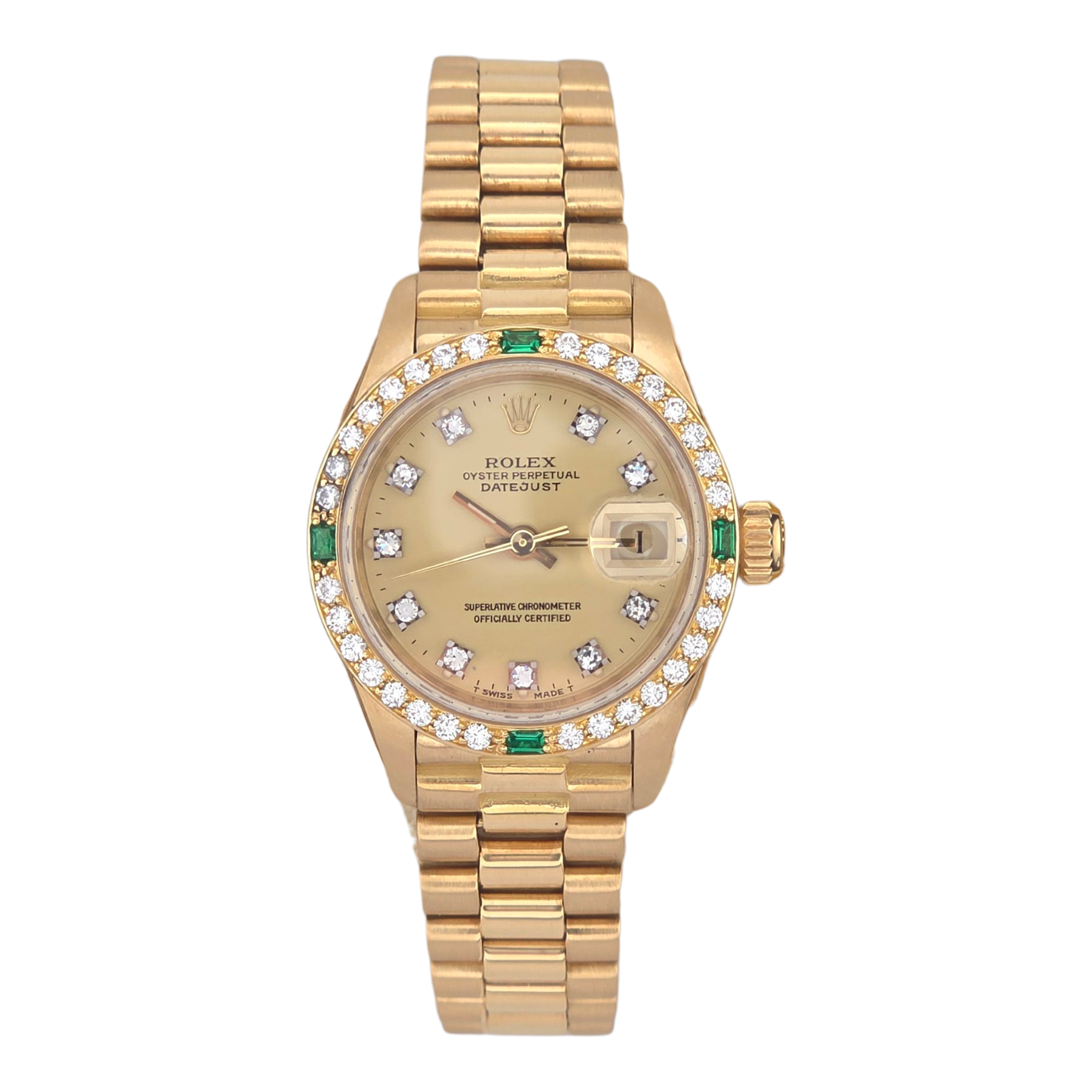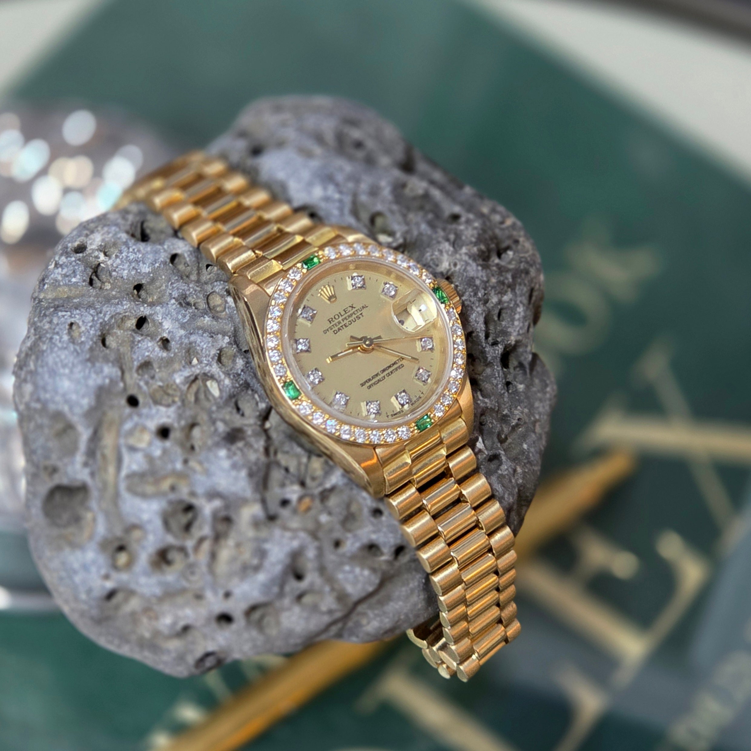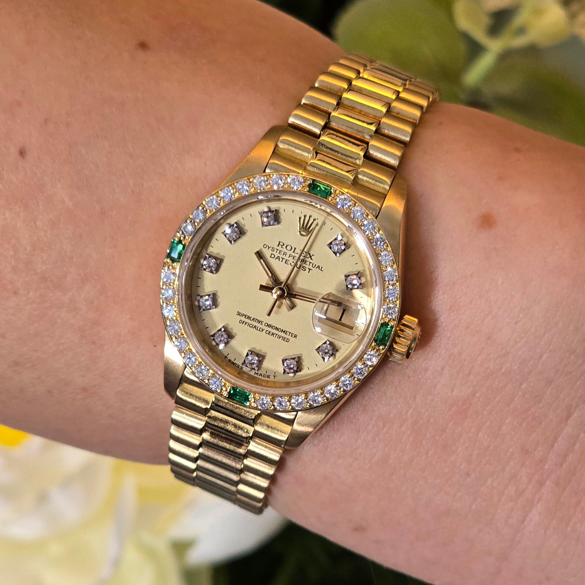Launched in 1945, the Rolex Datejust has cemented itself as one of the all time greats of the horological world. A staple of any collection, with an array of different models and customisations to be had. The example we have for sale here is a Ladies Datejust dated to 1986. It features factory Diamond Dot Hour Markers with after set Diamond, Emerald and 18ct Yellow Gold Bezel. The Case and Bracelet are also fashioned from 18ct Yellow gold making this a perfect companion to any special occasion.
