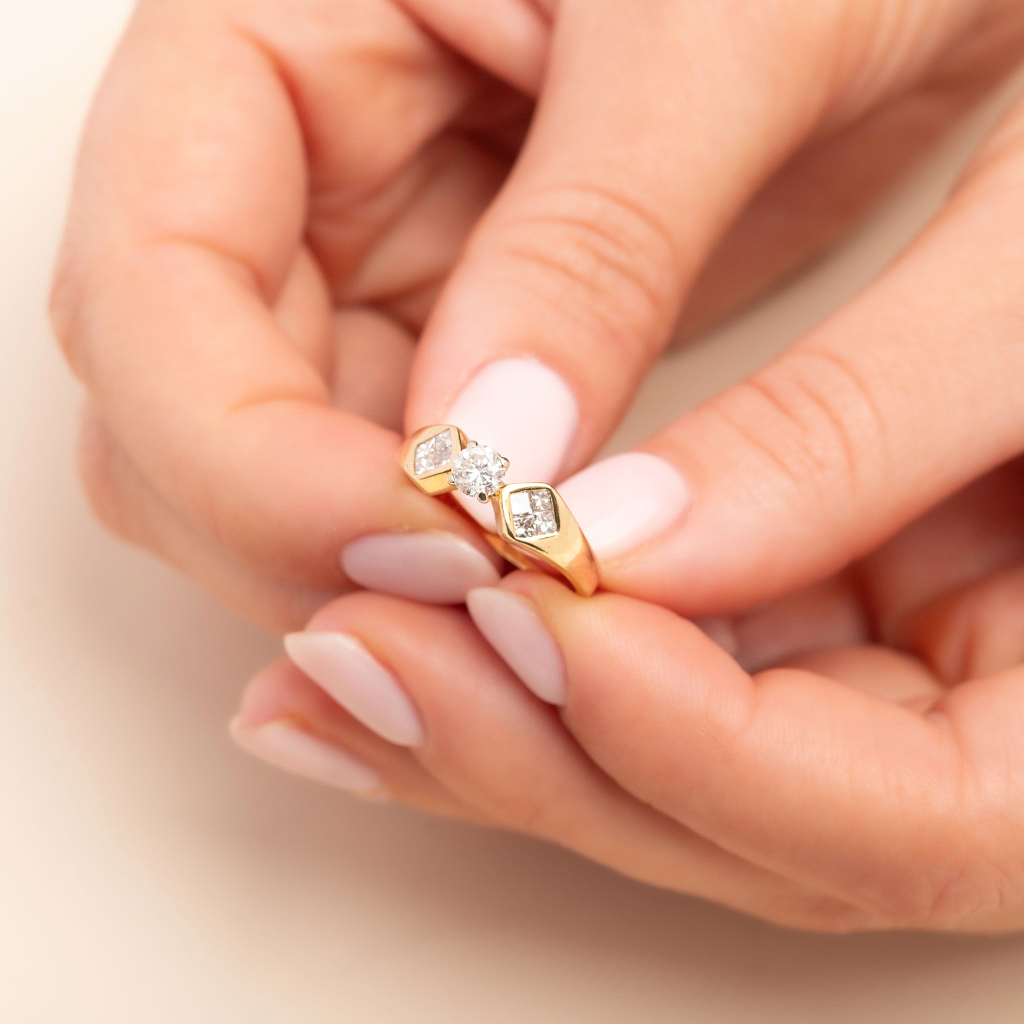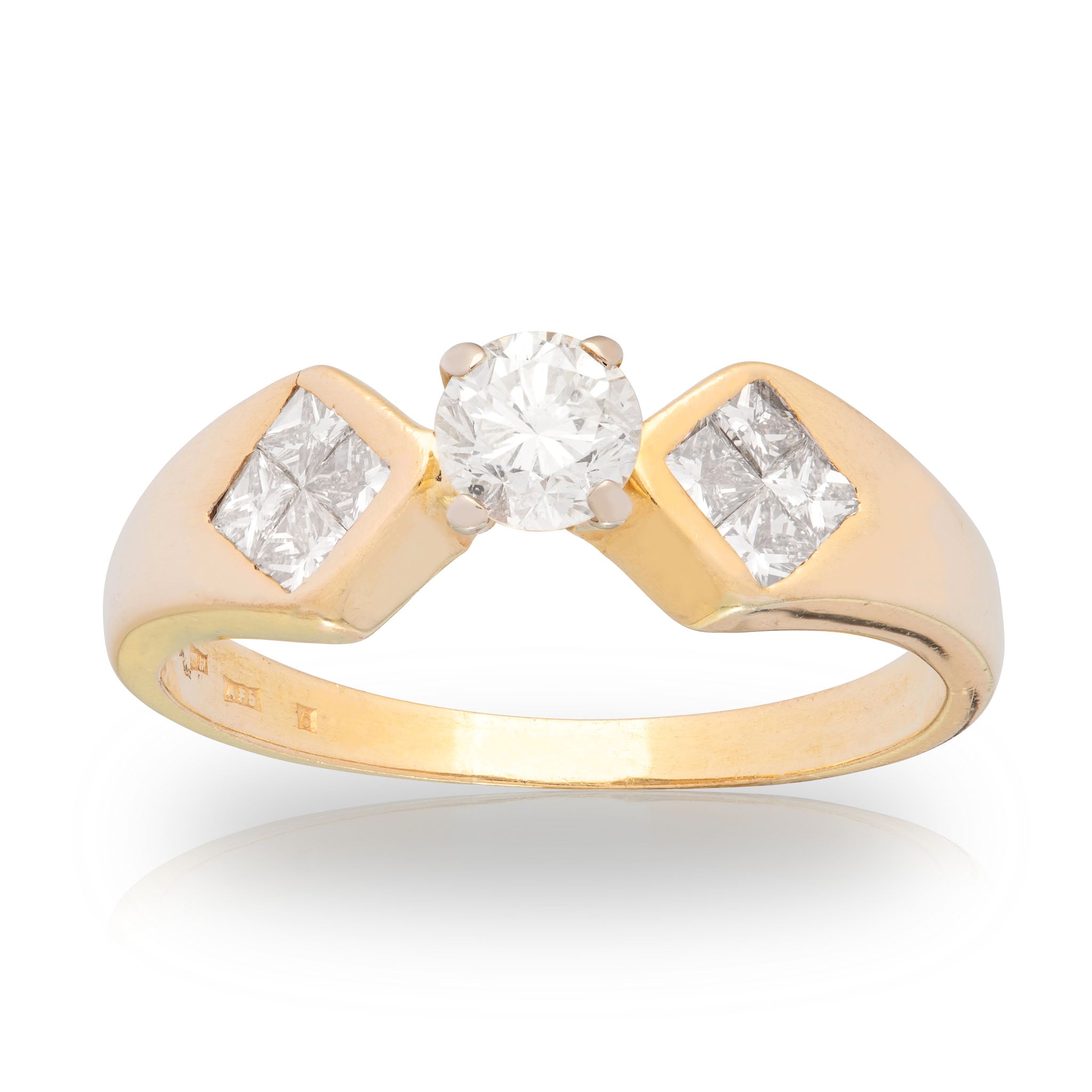 Four princess cut diamonds totalling 0.25ct, flush-set into the shoulders to each side in an angular setting that create a bold, geometric look