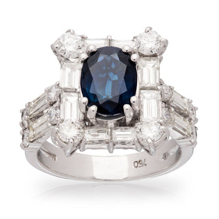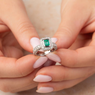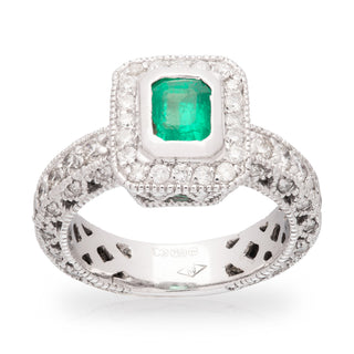 Art Deco Style 18ct White Gold 0.5ct Square Cut Emerald Trilogy & Diamond Cluster Ring