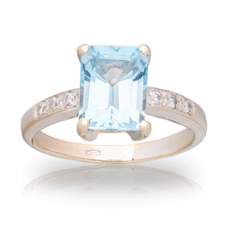 Art Deco Style 18ct Yellow Gold Emerald Cut Aquamarine & Diamond Halo Ring