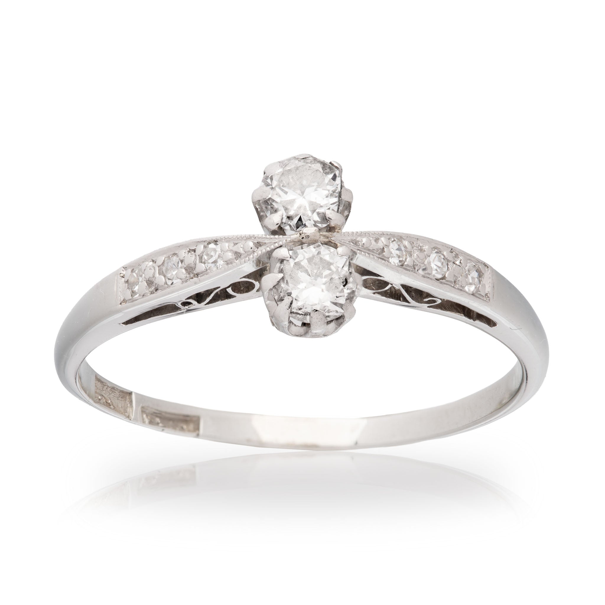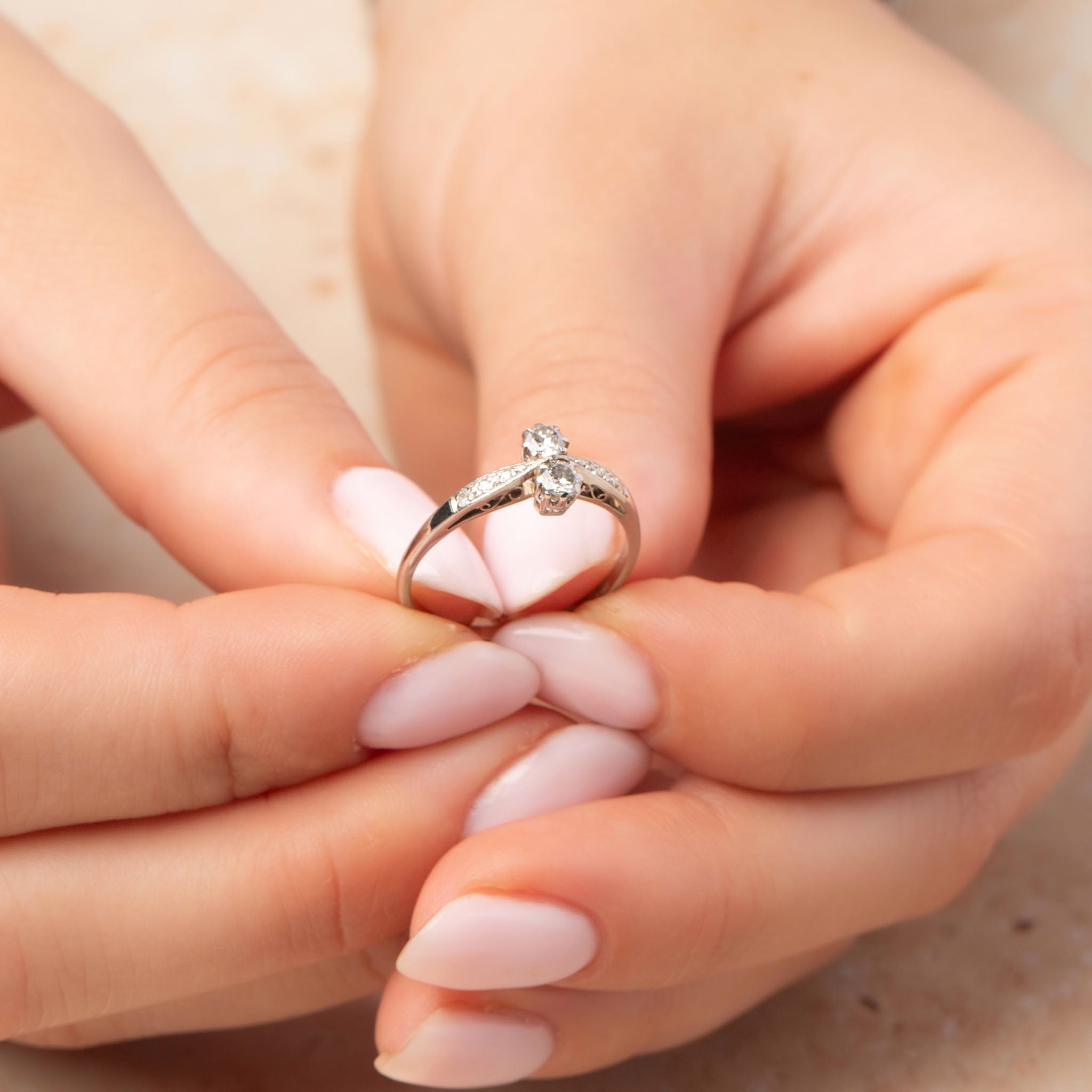 • Set with two perfectly matched round-cut diamonds in the Toi et Moi French style, symbolising unity and partnership