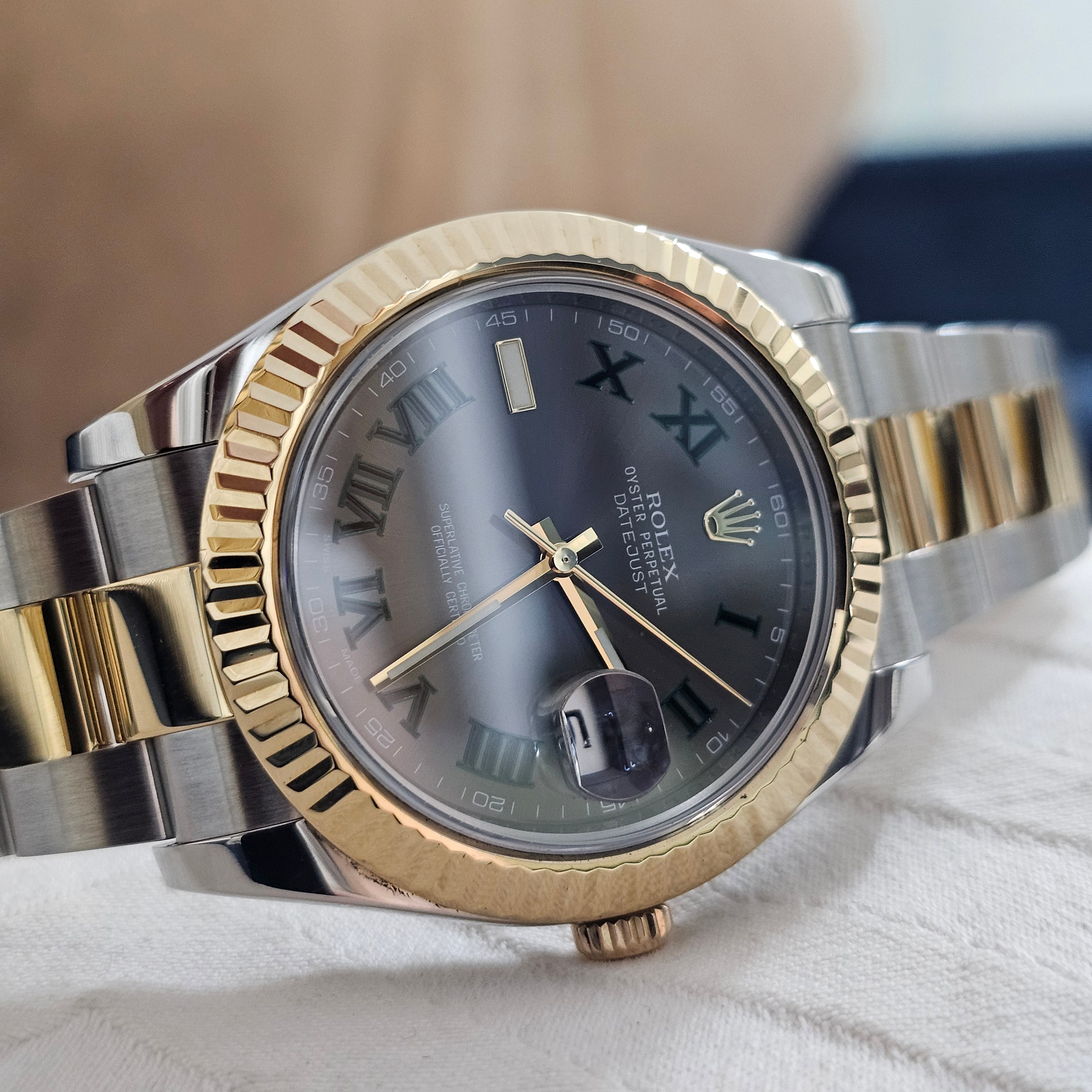 Designed to make a bold statement, the Rolex Datejust II “Wimbledon Dial” features a distinctive slate grey dial with bold green Roman numerals, paying homage to the prestigious Wimbledon tennis tournament. A rare and sought-after piece, it's an ideal choice for collectors and tennis enthusiasts alike.