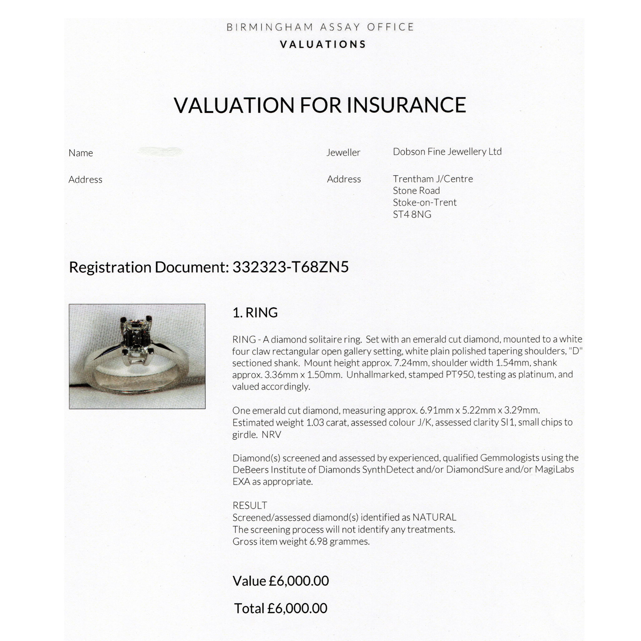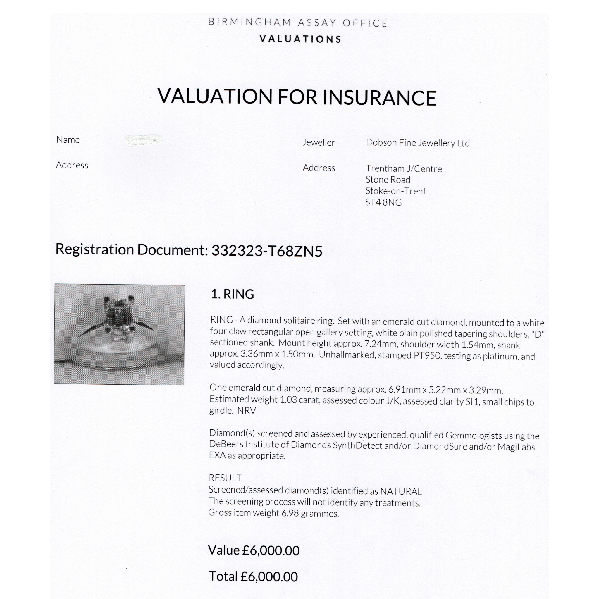 Platinum 1.03ct Emerald Cut Diamond Solitaire Ring