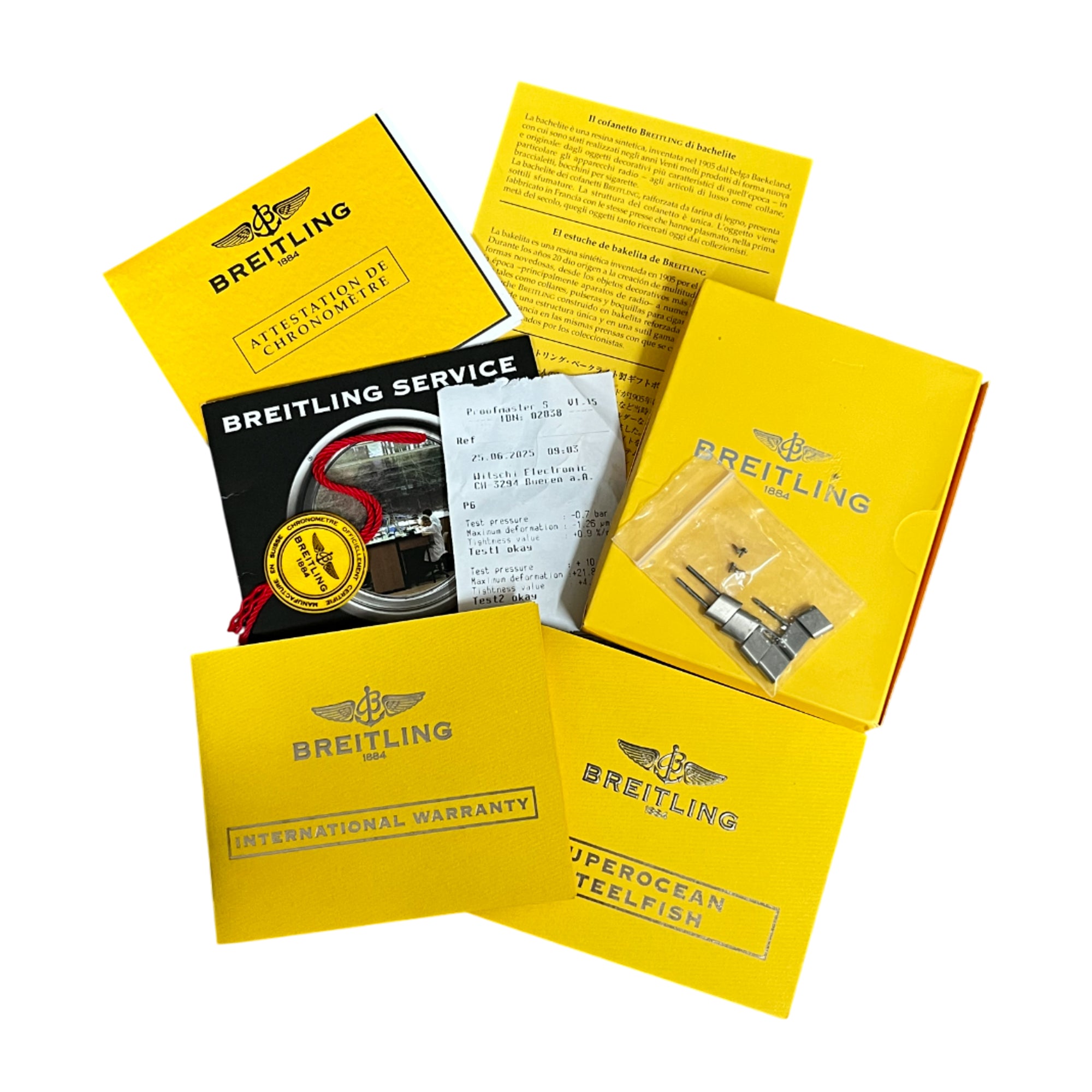• Original Breitling branded box, booklets, international warranty, swing tag, chronometre certificate and pressure test certificate