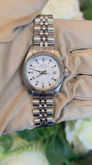 A perfect blend of vintage charm and everyday elegance, this timeless Rolex Oyster Perpetual Date features a crisp white dial that will complement any style.